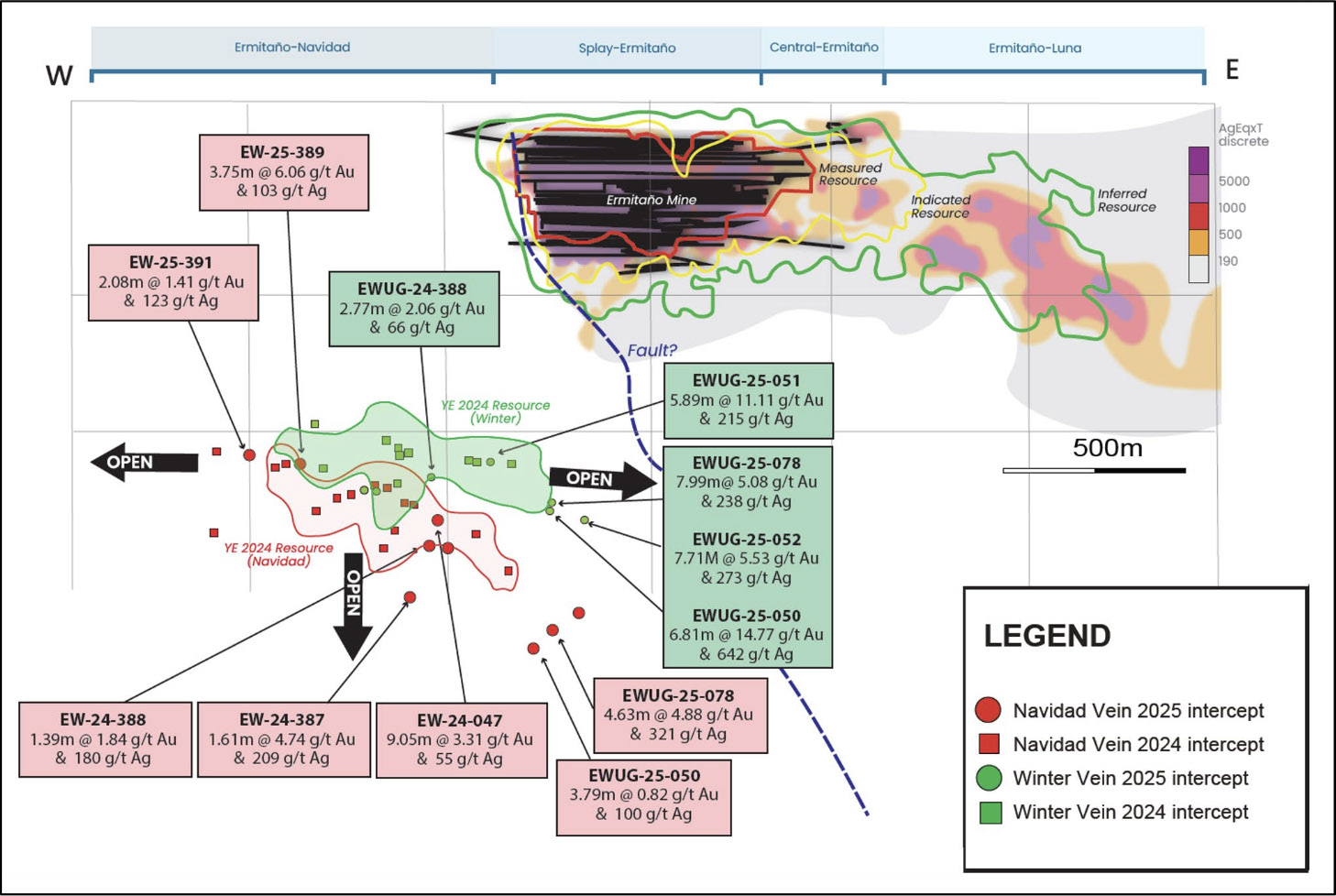 Drilling at the currently producing Ermitaño mine has delineated one primary, one secondary and several sub-parallel tertiary veins. The Ermitaño vein is delineated over 1,800 metres along strike and 550 metres down dip. The eastern extension of the vein is called the Luna or Ermitaño East Complex (Figure 2). The Ermitaño mine commenced production in Q4-2021. By the end of 2025 the Ermitaño mine had produced approximately 414,000 ounces of gold and 7.1 million ounces of silver.2