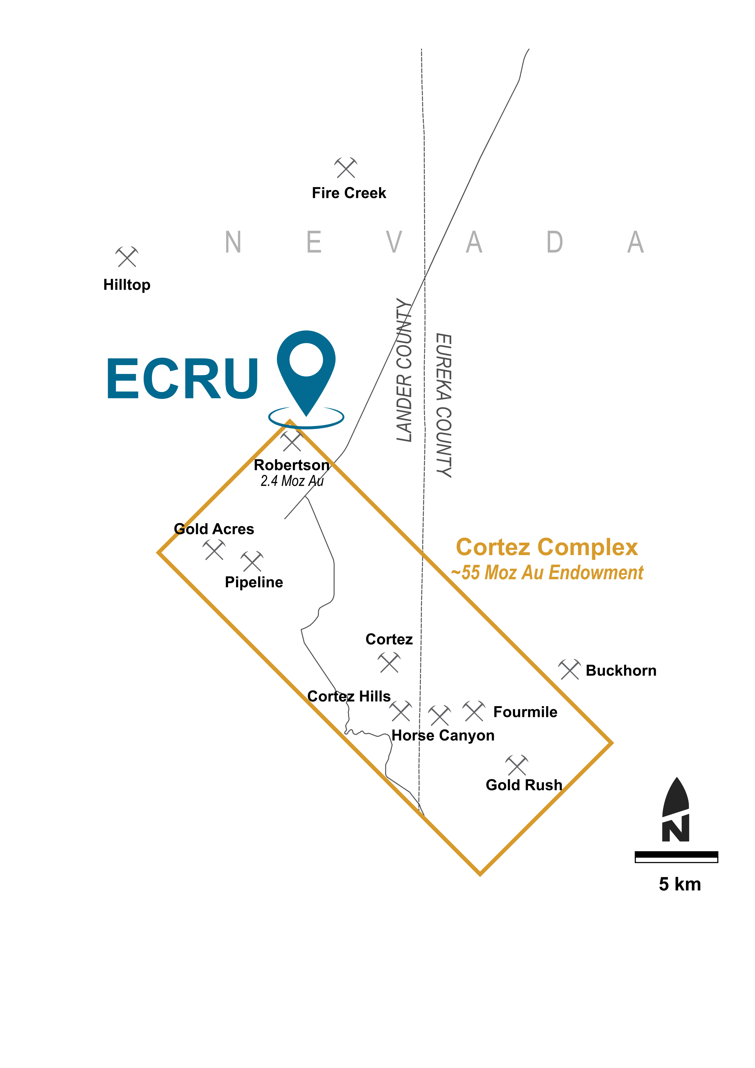 The Ecru project is located on the northeast margin of Nevada Gold Mine’s Cortez Trend land position (the Cortez Complex1) within the larger Battle Mountain - Eureka trend. The property consists of 112 lode-mining claims 100% owned by Orogen and two leased sections. The project lies immediately adjacent to Nevada Gold Mines’ 2.4 Moz Robertson reduced intrusion related gold deposit1 (Figure 1).