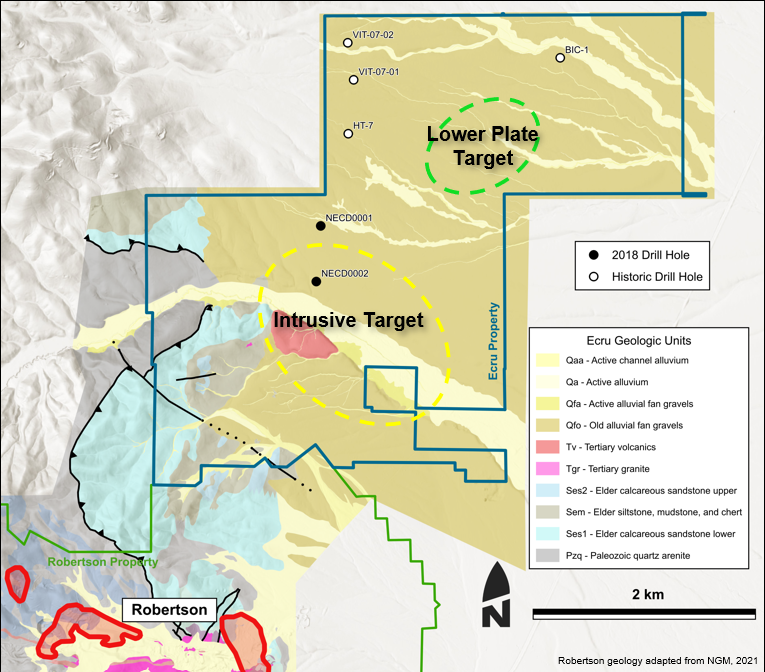 Figure 2: Overview of targets and simplified geology on the Ecru project. Robertson geology adapted from 1