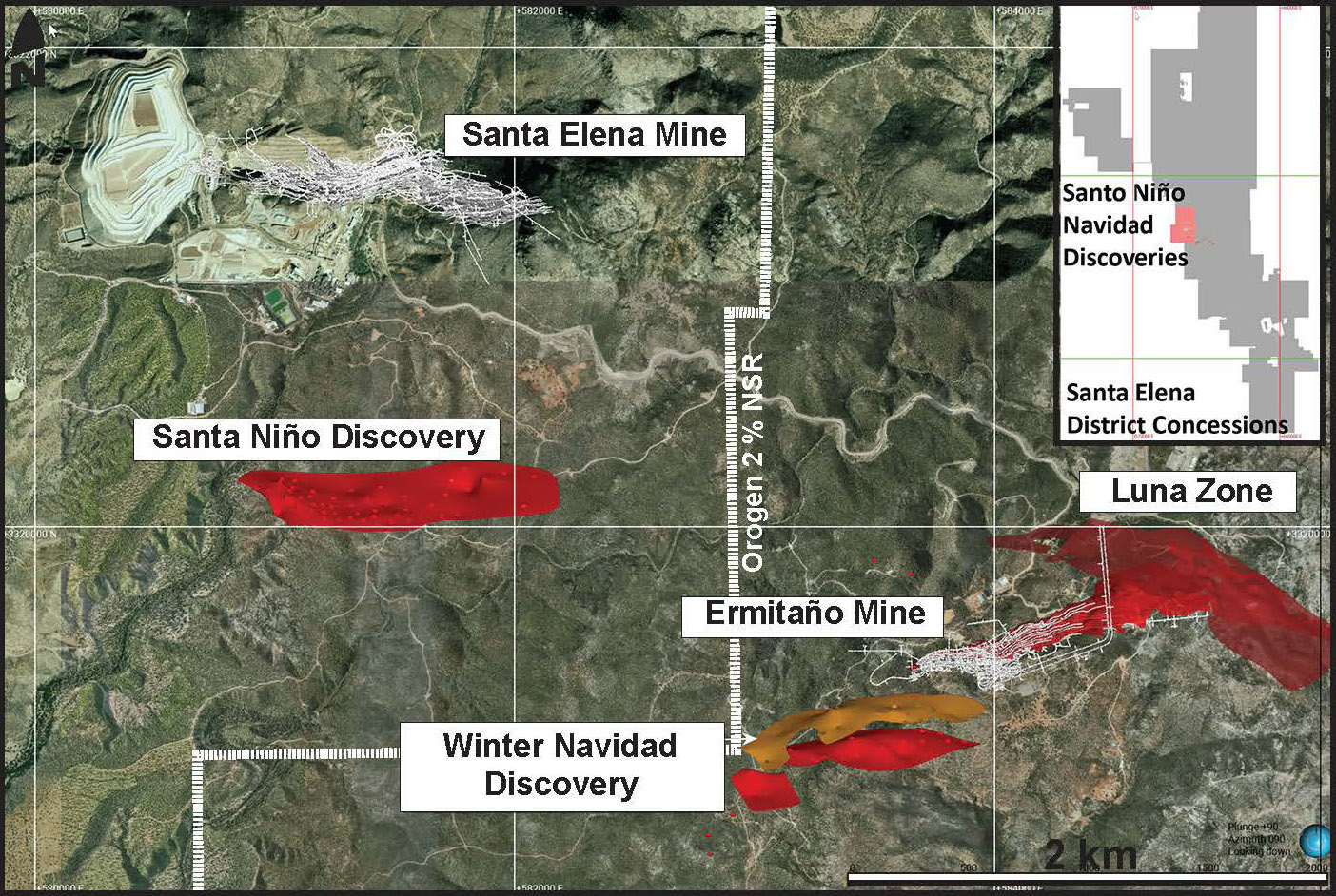 Orogen holds a royalty interest on the approximately 167 square-kilometre Ermitaño mining concession, located in Sonora, Mexico. Ermitaño is contiguous with the Santa Elena mining claims both of which are owned and operated by First Majestic. (Figure 1). Orogen’s area of interest contains the producing Ermitaño deposit, the Luna and Aitana veins, and the recently discovered Navidad/Winter vein systems.