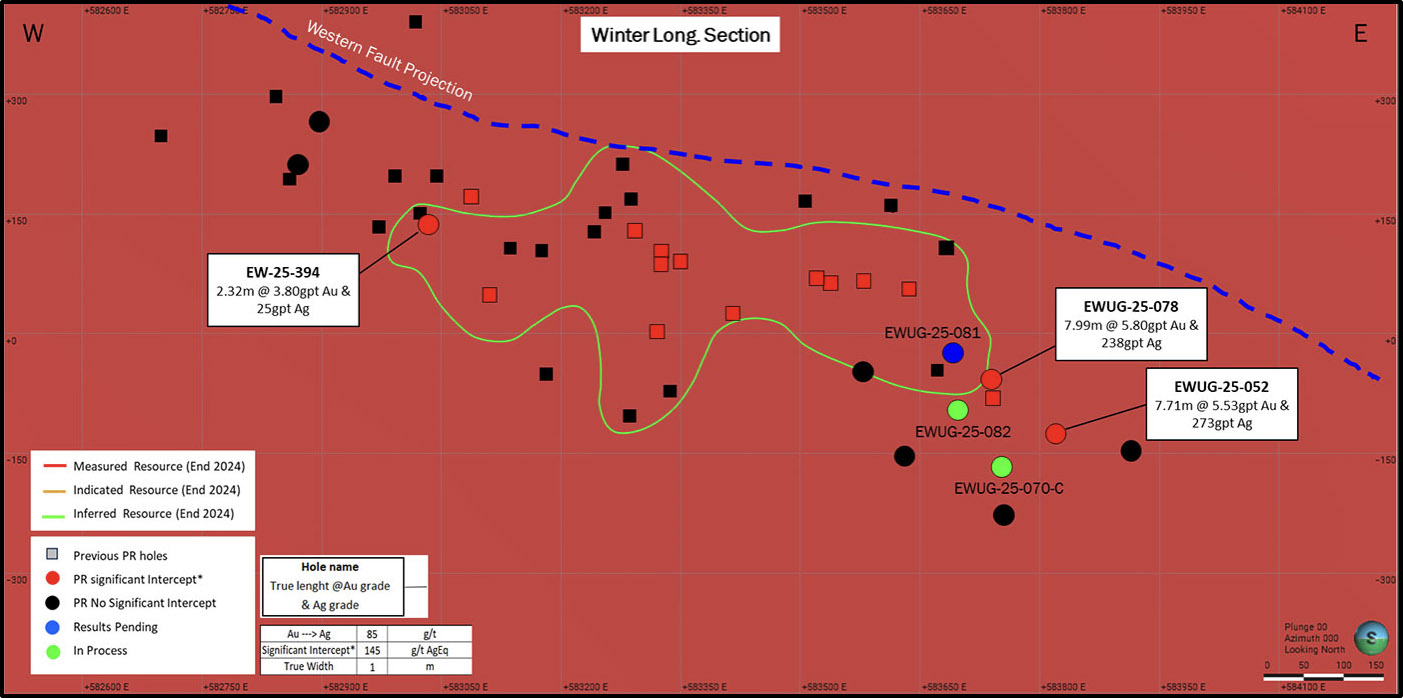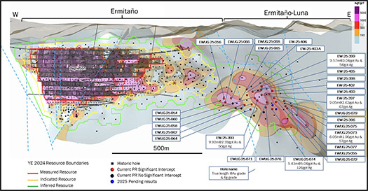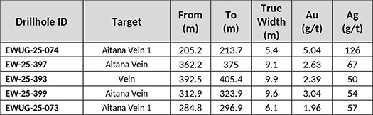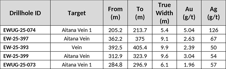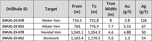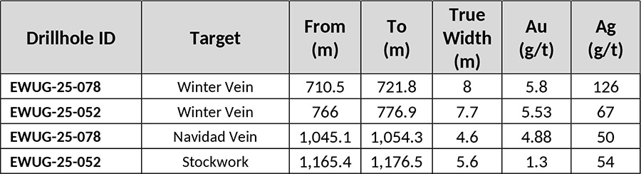 - Resource conversion drilling at the Ermitano-Luna area includes hole EWUG-25-074 grading 5.04 g/t gold and 126 g/t silver over 5.4 metres (true width)