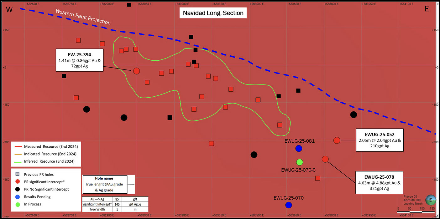 - Exploration drilling at the Navidad area includes EWUG-25-078 grading 5.8 grams per tonne ("g/t") gold and 126 g/t silver over 8.0 metres and 4.88 g/t gold and 50 g/t silver over 4.6 metres (true width)